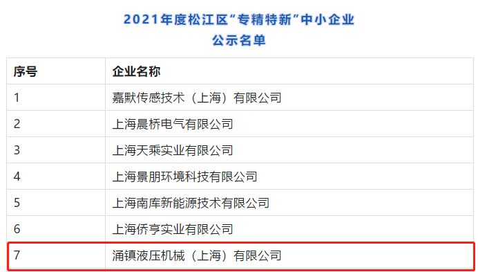《松江區“專精特新”中小企業發展專項支持實施細則(2020年版)》(滬松經〔2020〕165號),區經委組織開展了2021年度松江區“專精特新”中小企業申報和復核工作。涌鎮液壓充分發揮自身優勢,堅持獨立自主的研發與創新設計,憑借高效的產品創新能力和廣泛的市場認可度,成功申報并獲得上海市松江區“專精特新”的稱號。